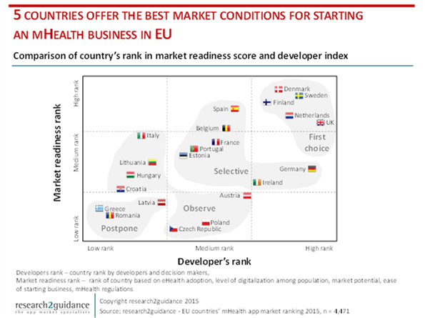 RIGA, Latvia, 12 May 2015: Denmark, Finland, The Netherlands, Sweden and the UK are the top five countries offering the best market conditions for mobile health app companies in Europe, according to a survey conducted by research2guidance in collaboration with HIMSS Europe. As part of the largest global mHealth research programme, research2guidance and HIMSS Europe have come together to analyse the market readiness of the 28 EU member states through “The EU Countries’ mHealth App Market Ranking” survey. Over 5,000 app developers, healthcare professionals and mHealth practitioners were asked to rank European countries based on their experience and provide reasons for their ranking. The practitioners view is combined with facts based evaluation for each country, based on five dimensions and 26 market condition criteria such as eHealth adoption, level of digitalization, market size and health expenditure, ease of starting a business and the mHealth regulatory framework. Denmark, Finland, The Netherlands, Sweden and UK proved to have the highest market readiness and most mature market conditions, providing the best starting points for mHealth companies to succeed. Out of these five countries though, the UK emerged as the leader according to 55% of mHealth practitioners. The study revealed that this is primarily due to the openness and positive attitude many doctors in the UK have when it comes to new technology and integrating mHealth solutions into patient treatments. *** [Click to enlarge] *** Ralf Jahns, Managing Director at research2guidance, who announced the survey findings at the mHealth Summit Europe, said: “The survey is now in its sixth year and the response this time has been overwhelming becoming increasingly evident that the momentum around mHealth is growing at a rapid pace. The report is extremely valuable for anyone thinking about starting an mHealth company, as well as for government organisations in European countries that want to benefit from a flourishing mHealth ecosystem through creating highly qualified jobs, reducing national healthcare costs and ensuring high levels of quality of care.” Germany and France emerged with mixed results: on the one hand these two markets have enormous potential when it comes to the amount which has been invested in patients, doctors, hospitals and healthcare on a whole. However, rankings for eHealth and mHealth adoption in Germany and France were extremely low, showing these countries are more reluctant to embrace the digitalisation of healthcare, thus classifying themselves as “average” countries to invest in mHealth. Rainer Herzog, General Manager at HIMSS Europe added: “The timing of the report is particularly important as it coincides with the mHealth Summit Europe which will bring together the most important stakeholders in the mHealth industry in Europe. The survey results will provide a great platform for discussion and give us an insight into how ready European countries really are to adopt mHealth and the challenges that some countries are yet to overcome, meanwhile giving entrepreneurs a head-start when deciding which country would be best to start an mHealth business.” To view the full report please click here: About research2guidance: ABOUT Research2guidance is a strategy advisory and market research company. Research2guidance concentrates on the mobile app eco-system and are convinced that mobile health solutions will make a difference to people’s lives and that the impact on the healthcare industry will be significant. The organisation provides insights to make it happen and to successfully lead a business. |