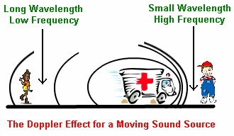 Wikipedia: The reason for the Doppler effect is that when the source of the waves is moving towards the observer, each successive wave crest is emitted from a position closer to the observer than the crest of the previous wave. Therefore, each wave takes slightly less time to reach the observer than the previous wave. Hence, the time between the arrivals of successive wave crests at the observer is reduced, causing an increase in the frequency. While they are traveling, the distance between successive wave fronts is reduced, so the waves “bunch together”. Conversely, if the source of waves is moving away from the observer, each wave is emitted from a position farther from the observer than the previous wave, so the arrival time between successive waves is increased, reducing the frequency. The distance between successive wave fronts is then increased, so the waves “spread out”.