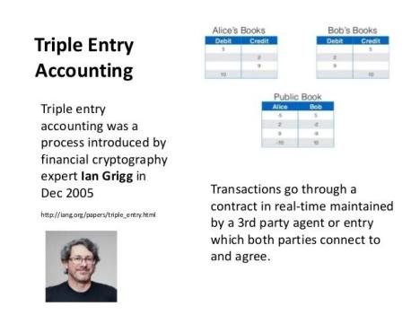 The term “Triple Entry Accounting,” was first used by Ian Grigg, financial cryptographer, and described in his paper published in 2005, three years before the emergence of Bitcoin and its underlying Blockchain protocol.