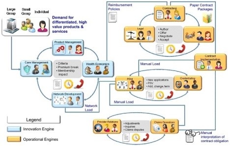 Evolving in parallel with individual models is an understanding that the ability to mix and match different reimbursement designs will deliver greater value than the utilization of just one design. Health plans are mixing and matching different reimbursement methodologies to optimize provider performance. This implies that a provider is likely to have multiple valid payment arrangements at any given time. Picking the appropriate payment arrangement will require the reimbursement engine to understand the role of the provider in the network and the full context of all of the provider’s relationships.