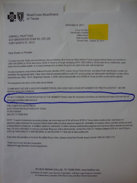 BCBSTX is a non-profit whose handsome profits are paid by taxpayers. The healthcare parasite sells dental insurance to theUSgovernment for federal employees. In their letter to me that I’ve attached, you can see for yourself that along with BCBSTX’s stated refusal to process any of their clients’ dental claims that come from my office, it says in capital letters, “DO NOT FORWARD THIS NOTIFICATION TO THE MEMBER!” How proud does it make you feel to know BCBSTX defines your level of ethics, TDA Board? Two years ago, your Director of Membership censored from the TDA Facebook this dentist’s criticism of BCBSTX’s NPI demands. Sometimes, you bozos are idiots.
