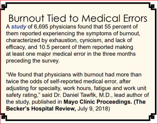 Burned out physicians will eventually be labeled as disruptive, impaired, an outlier or arrogant. There’s a reason it’s difficult and extremely expensive for physicians to find disability insurance; psychiatric claims. Burnout leads to depression, anxiety, PTSD, suicide, divorce, drug abuse, surly behaviors and interactions, etc. It’s nothing new; it’s been occurring for a long time. Go without routine sleep, eat erratically, work long hours, operate under constantly stressful situations and have no time for your family or self and most individuals will de-compensate physically and psychologically within weeks.