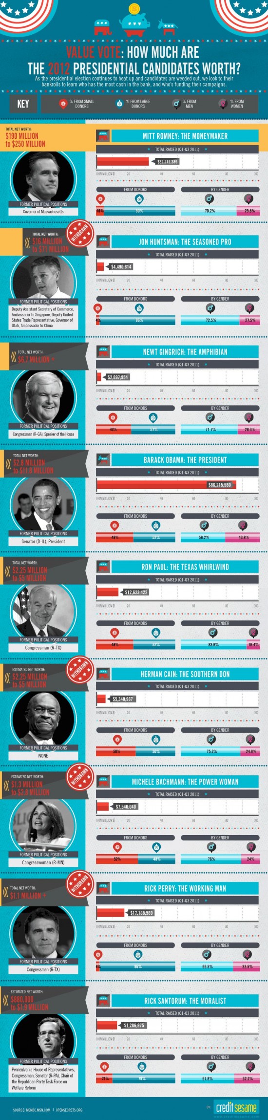 As the presidential election continues to heat up for “Super Tuesday” this March 6th 2012 – and candidates are weeded out – we look to their bankrolls to learn who has the most cash in the bank, and who’s funding their campaigns.